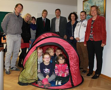 Anlässlich einer Spendenübergabe an die städtischen und an die katholischen Kindergärten erhielt Bürgermeisterin Marianne Zollner Besuch. Die Firma BB Sport GmbH & Co. KG aus Töging a. Inn überreichte Sachspenden im Wert von ca. 1.500 €. Die anwesenden Kinder probierten gleich das Wurfzelt aus und bezeichneten es als „Zauberzelt“. Auch die Yogamatten und selbstaufblasbaren Matten werden großen Anklang in den KiTas finden.