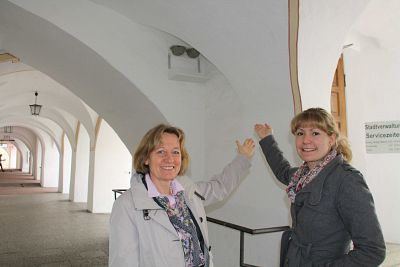 Bei der Besichtigung der neuen Brutplätze sind sich Bürgermeisterin Marianne Zollner und Simone Lanzinger von der unteren Naturschutzbehörde einig, dass hier mit wenig Aufwand viel bewirkt werden kann. Bürgermeisterin Zollner ergänzt: „Wir würden es sehr begrüßen, wenn weitere Hauseigentümer am Stadtplatz solche Nester in den Arkaden schaffen würden.“
