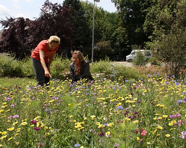 Auf einigen öffentlichen Grünflächen sind derzeit herrlich bunte Wiesenblumen erblüht, beispielsweise bei der neuen Grünanlage am Stadtberg. Bürgermeisterin Marianne Zollner ist ganz begeistert von der Blütenpracht. „Ich freue mich jedes Mal, wenn ich vorbeifahre, z.B. morgens mit dem Fahrrad auf dem Weg ins Rathaus.“ Bei einem Treffen mit der Gärtnermeisterin der Stadt Frau Silvia Halmbacher erfährt sie, dass für die Erstaussaat eine schnell wachsende, sehr bunte, aber nur einjährige Saatmischung verwendet wurde. Die Blumen sollen als Blickfang dienen, damit die Mühldorferinnen und Mühldorfer auf ihre neue Erholungsoase aufmerksam werden.
