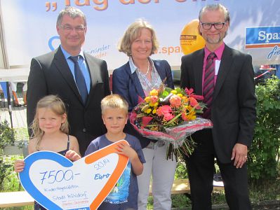 Mit einem Tag der offenen Tür feierte die Sparda Bank in Mühldorf a. Inn Ihr 20jähriges Bestehen. Geschäftsstellenleiter Thomas Pawelka und Regionalleiter Südost, Alois Kraller, begrüßten Bürgermeisterin Marianne Zollner mit einem großen Blumenstrauß und überreichten Ihr in Anwesenheit von Kindergartenkindern und Leiterinnen der Mühldorfer Kindertagesstätten einen Scheck in Höhe von 7.500 Euro. Bürgermeisterin Marianne Zollner bedankte sich für die großzügige Spende und freute sich diesen Betrag an die Kinderbetreuungseinrichtungen weiterleiten zu können. Da vor der Filiale der Sparda-Bank eine Feuerwehrdrehleiter wartete, um vielen Besuchern einen Blick über die Dächer von Mühldorf zu ermöglichen, nutzten auch die Bürgermeisterin und Thomas Pawelka die Gelegenheit, diesen interessanten hohen Ausblick zu genießen.