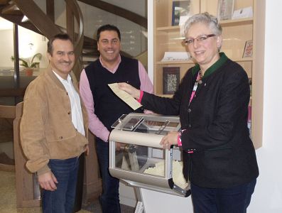 Bürgermeisterin Ilse Preisinger-Sontag zieht unter den zahlreichen Einsendungen den Hauptpreis der Verlosung: ein Wochenende in Mühldorf, d.h. 2 Übernachtungen mit Halbpension gesponsert vom Hotel Bastei.