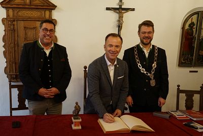 Bürgermeister Michael Hetzl überreichte ihm als Andenken eine Brunnenbuberl-Figur, deren Plakettentext die „freundschaftliche Verbundenheit“ der beiden Städte betont. „Wir alle in der Stadtverwaltung sind froh und äußerst angetan davon, dass wir Bürgermeister Auinger im Rathaus begrüßen durften“, erläutert der Bürgermeister. „Nach Landeshauptmann Dr. Wilfried Haslauer, der bekanntlich die Salzburger Delegation beim Festakt 2022 anführte, steht nun auch der Name des Salzburger Stadtoberhaupts in unserem Goldenen Buch. Für uns ist das ein weiterer Meilenstein in der Vertiefung unserer langjährigen Freundschaft mit Salzburg, deren Ausbau wir auch für die Zukunft anstreben. Es ist wunderbar, dass unser gemeinsames geschichtliches Erbe in jüngster Zeit immer stärker gelebt wird. Zur Bedeutung dieses aktuellen Besuchs muss man wissen, dass wir seit langer Zeit hervorragende Beziehungen zum Bundesland Salzburg pflegen. Nun gelingt es uns, auch die Stadt Salzburg mit in dieses gemeinsame Boot zu holen. Umso mehr freue ich mich, dass es Bürgermeister Auinger und seiner Delegation bei uns gefällt und dass er wiederkommen will. Wir besuchen Salzburg immer sehr gerne. Herzlichen Dank für die Einladung, die ohne jegliches Zögern angenommen ist, und die mitgebrachten Geschenke wie das stadtnamensgebende Salz.“