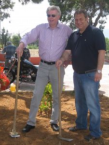 Der zweite Tag begann mit Baumpflanzen auf einem - mit Bänken, Blumen und Bäume - neu gestalteten Erholungs- und Begegnungsplatz. Die ersten neuen Bäume wurden in tatkräftiger Zusammenarbeit von Bürgermeister Vlassopoulos und Bürgermeister Knoblauch unter Beifall einer großen Zahl Iraklier Bürger gepflanzt.