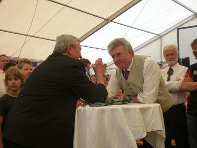 Mächtig ins Zeug gelegt hat sich Bürgermeister Günther Knoblauch auch beim 1. Mühldorfer Wettbewerb im Armdrücken. Die Gastgeber aus Oberösterreich organisierten für die Teilnehmer am Mühldorf-Treffen neben den Ständen, an denen es Spezialitäten aus den einzelnen Regionen gab, auch einen Besuch auf dem angrenzenden Golfplatz. Außerdem wurde ein gemeinsamer Gottesdienst, der den 2. Tag des Internationalen Mühldorf-Treffen einläutete, gefeiert.