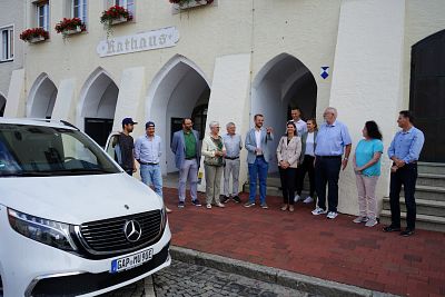 Seit heute sind im Stadtgebiet zwei Elektrofahrzeuge mit jeweils sieben Sitzplätzen für Passagiere im Rufbus-Probebetrieb unterwegs. Zum Start des „Rufbus Mühldorf“ machten sich neben den lokalen Medien und Bürgermeister Michael Hetzl einige Stadträtinnen und Stadträte selbst ein Bild. Zweite Bürgermeisterin Ilse Preisinger-Sontag, Verkehrsreferent Dr. Georg Gafus, Wirtschaftsreferentin Karin Zieglgänsberger und Schulreferent Dr. Reinhard Wanka nahmen ebenso an einer Probefahrt teil wie Rechtsamtsleiter Peter Abt und Daniela Goldbacher, stellvertretende Ordnungsamtsleiterin und bei der Kreisstadt Mühldorf a. Inn verantwortlich für den öffentlichen Personennahverkehr. Zum kurzen Präsentationstermin kamen außerdem die Gremiumsmitglieder Oskar Stoiber, Rudi Salfer, Andreas Seifinger und Isabella Bathen. Sie allen nutzten die Gelegenheit, auch um Clemens Deyerling und Robert Schotten, die beiden Geschäftsführer des Rufbus-Dienstleisters omobi GmbH aus Murnau, kennenzulernen. „Aus unserer Sicht hat die Einführung in Mühldorf in besonderem Maße reibungslos geklappt“, berichtete Deyerling. „Es ist gut, dass es jetzt endlich losgeht mit dem Probebetrieb“, sagte Bürgermeister Michael Hetzl. „Probebetrieb bedeutet, dass wir aus den Erfahrungen der kommenden Wochen lernen wollen und werden und bei Bedarf zügig Anpassungen und Verbesserungen möglich sind.“