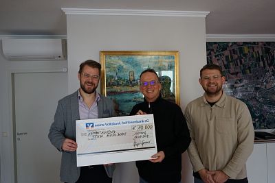 Die Kirche 365 spendet der Kreisstadt Mühldorf a. Inn 10.000 Euro. Bürgermeister Michael Hetzl empfing zur symbolischen Scheckübergabe im Rathaus Jürgen Gramer, den Mühldorfer Pastor der evangelischen Freikirche.