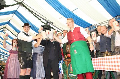 Rund 4000 Besucherinnen und Besucher feierten auf Einladung der Kreisstadt Mühldorf a. Inn den „Tag des Landkreises“ im Spaten-Festzelt auf dem Traditionsvolksfest. Bürgermeister Michael Hetzl konnte am Dienstag neben Landrat Max Heimerl als Mit-Gastgeber unter anderem die Bundestagsabgeordnete Sandra Bubendorfer-Licht und den Landtagsabgeordneten Hans Friedl als Ehrengäste begrüßen; außerdem die Zweite Bürgermeisterin Ilse Preisinger-Sontag und Bezirksrätin Claudia Hausberger stellvertretend für die anwesenden Stadträte und seinen Waldkraiburger Kollegen Robert Pötzsch für das Gemeinsame Oberzentrum und stellvertretend für die vielen Gäste aus anderen Kommunen aus dem Landkreis Mühldorf und der Nachbarschaft. An die Genannten und rund drei Dutzend weitere Bürgermeisterinnen und Bürgermeister verschenkte Bürgermeister Hetzl im Namen der Kreisstadt Mühldorf Volksfestherzerl, bevor es im regnerischen Abend zur gemeinsamen Fahrt mit dem Riesenrad ging.