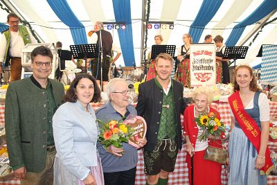 Johanna Fuchs war mit 101 Jahren die älteste Besucherin, Josef Knipf mit 100 Jahren der älteste Besucher des Seniorennachmittags. Beide erhielten von Bürgermeister Michael Hetzl einen Blumenstrauß und ein Volksfestherzerl. 60 tolle Präsente gab es im Anschluss bei der traditionellen Verlosung zu gewinnen – darunter viele Geschenkkörbe.