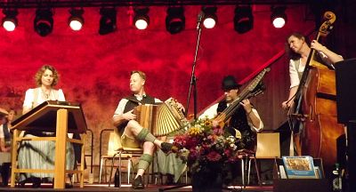 Super Stimmung brachten auch Kabarettist Andreas Rebers zusammen mit der neuen Generation der Familie Well, den nouWell cousines, am 11. Juli nach Mühldorf. In gewohnter Well’scher Manier trugen die nouWell cousines scharfzüngig ihre Sicht der Dinge vor, musikalisch immer auf höchsten Niveau.