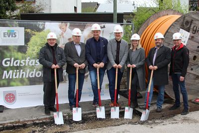 Die Bauarbeiten für den Breitbandausbau in der Kreisstadt Mühldorf a. Inn haben begonnen. Zum Spatenstich an der Buchnerstraße versammelten sich um Bürgermeister Michael Hetzl und Julia Gartner von der städtischen Wirtschaftsförderung Vertreter der Projektpartner: von der Energieversorgung Inn-Salzach GmbH (EVIS) die beiden Geschäftsführer Anton Erb und Alfred Lehmann, von der M-net Telekommunikations GmbH aus München Regionalmanager Gerhard Krämmer und der Leiter des Kooperationsmanagements Oliver Baumann sowie von der ausführenden Baufirma Streicher Niederlassungsleiter Christoph Huber. „Mit dem Spatenstich ist ein weiterer Meilenstein zur flächendeckenden Versorgung mit schnellem Glasfaser-Internet erreicht“, sagt Bürgermeister Hetzl.