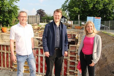 Der Baustart für ein Doppelhaus Auf der Lände ist erfolgt. Die Stadtbau Mühldorf a. Inn GmbH baut dort im Auftrag der von der Kreisstadt Mühldorf a. Inn verwalteten Heiliggeistspitalstiftung. Den zu Grunde liegenden Generalübernehmervertrag hatte der Stadtrat im Februar genehmigt. Bürgermeister Michael Hetzl und Stadtbaumeisterin Birgit Weichselgartner machten sich im Beisein von Stadtbau-Geschäftsführer Gerhard Mühlhans vor Ort ein Bild vom Beginn der Bauarbeiten und nahmen die ersten Kellerwände in Augenschein. In einem Jahr soll das Doppelhaus stehen.