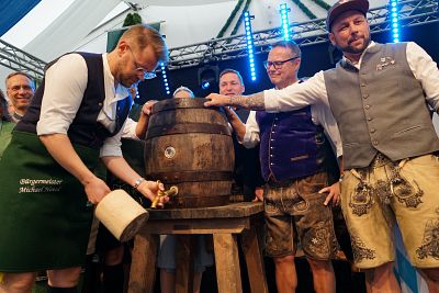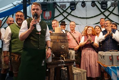 Seit Freitagabend, 18:37 Uhr läuft das Mühldorfer Traditionsvolksfest. Mit drei Schlägen zapfte Bürgermeister Michael Hetzl im Spaten-Festzelt das erste Festbier-Fass an. Im Beisein von Volksfestkönigin Simona Kneißl, Volksfestorganisator Walter Gruber, Festwirten und Ehrengästen eröffnete der Bürgermeister das Volksfest mit einem lauten „O‘ zapft is“. Daraufhin brach sich im prall gefüllten Zelt lautstarke Begeisterung Bahn. „Wie die Besucherinnen und Besucher fiebern auch wir seit Wochen dem Start entgegen“, sagt Michael Hetzl. „Wir freuen uns sehr, dass es jetzt endlich soweit ist.“ Kulturamtsleiter Walter Gruber pflichtet bei: „Wirte, Schausteller und sämtliche Beteiligte – alle hier sind bereit. Das Wichtigste bis zum Volksfestausklang am 8. September ist jetzt, dass die Gäste von nah und fern sich wohlfühlen und Spaß haben. Insgesamt rechnen wir mit 250.000 Besucherinnen und Besuchern unseres Traditionsvolksfests.“ Am Freitagabend nach dem Anzapfen klappte das mit dem Spaßhaben nahtlos – mit d‘Moosner im Spaten-Festzelt, The Soundscape im Erhartinger-Festzelt und der Heldensteiner HeuBodnBlosn im Innbräu-Festzelt.