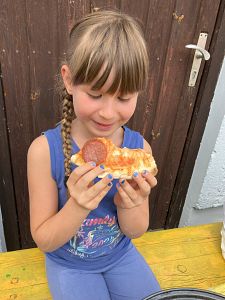 Pizzabacken im Erdofen ist beim Ferienprogramm des Mühldorfer Jugendzentrums M24 seit Jahren ein Renner. Darum stand das vom Förderverein Jugendzentrum Mühldorf e.V. bezuschusste Angebot für Sechs- bis Zwölfjährige heuer gleich dreimal im Mühlix-Kalender. Ist ja auch eine runde Sache von Anfang bis Ende: Erst im coolen JUZ-Bus gemeinsam die Zutaten einkaufen, dann den Teig kneten und später nach Herzenslust belegen. Und die Krönung nach dem Backen im Erdofen: das Reinbeißen in die krosse Köstlichkeit und der Genuss jeden Bissens!