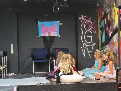 Viel Fantasie und gute Laune, mehr mussten die Kinder zu drei Workshops im Rahmen des diesjährigen Mühlix-Ferienprogrammes nicht mitbringen. An zwei Tagen, jeweils von 13:30 bis 18:30 Uhr, lernten die Kinder, miteinander auf der Bühne zu interagieren. Sie suchten sich selbst frei Rollen aus, aus denen sie dann gemeinsam eine Geschichte entwickelten. Es wurden Kostüme von zu Hause mitgebracht, Requisiten und Bühnenteile im JUZ gebastelt, und es wurde ein Stück mit dem Namen „Happy Grimmbad“ geprobt. Bis zur Premiere am zweiten Tag des Workshops. Dann hieß es: Vorhang auf! Die anwesenden Eltern waren begeistert