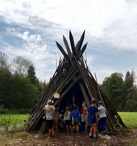 Ein Höhepunkt war die Fahrt mit der Inn-Fähre auf die andere Seite des Inns, wo die Kinder den Biberbau (ähnlich aussehend wie ein Tipi) besuchen konnten. Anschließend verglichen sie ihre Sprungkraft mit Tieren. Da die Tontöpfe und Regenmacher aber im „Lager“ geblieben waren, ging es mit der Fähre wieder zurück. Die Kinder pflanzten schließlich selbstständig Kräuter und Gemüse, machten ihre Regenmacher fertig und probierten diese gleich aus – mit Erfolg, denn bald danach kam der lang ersehnte Regen.