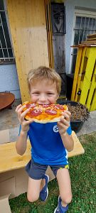 Sie stellten jeweils selber ihren Hefeteig her und ließen ihn ruhen. Da die Pizza gebacken werden musste, heizten die Teilnehmer ihren Erdofen mit Holz kräftig ein. Zu einer guten Pizza gehört natürlich auch eine Tomatensoße, die nach eigenem Geschmack gewürzt wurde. Da man über Geschmäcker nicht streiten kann, hatten die Kinder, die Möglichkeit, die eigene Pizza individuell zu gestalten und zu belegen. Dann musste sie nur noch gebacken und genossen werden. Die Pizza wurde mit großem Appetit gegessen.