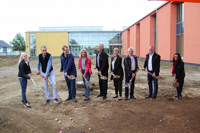 Nachdem bereits in den letzten Jahren vorübergehend eine Modullösung errichtet und Fachräume zum Klassenunterricht genutzt wurden, fand heute mit dem Spatenstich der Startschuss für den Erweiterungsbau der Mittelschule in Mühldorf a. Inn statt. Durch die Baumaßnahme werden insgesamt zwölf zusätzliche Klassenzimmer geschaffen, sowie neue Fachräume für Werken und eine Lehrküche. Die Erweiterung umfasst eine Nutzfläche von 1.555 Quadratmetern, der umbaute Raum liegt bei 8.870 Kubikmetern. Neuerungen gibt es auch im Bestandsgebäude, denn aufgrund der zusätzlichen Klassenzimmer wird es hier Umbauten im Bereich des Lehrerzimmers und der Mensa geben. Der Neubau ist deutlich größer als geplant und aktuell eines der größten Projekte der Kreisstadt Mühldorf, so 1. Bürgermeister Michael Hetzl. Ganz besonders betonte er, dass sich dieses Projekt ohne Neuverschuldung realisieren lässt. Die Gesamtkosten werden mit ca. 11,4 Millionen Euro veranschlagt. Die Fertigstellung ist für Ende 2023 geplant. „Wir hoffen auf eine unfallfreie Baustelle“, so der Rathaus-Chef und die Stadtbaumeisterin Birgit Weichselgartner.