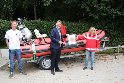 Mit einem neuen Wimpel, der das Stadtwappen und die Aufschrift Kreisstadt Mühldorf a. Inn zeigt, besuchte vor kurzem 1. Bürgermeister Michael Hetzl die Wasserwachts-Ortsgruppe Mühldorf. Ortsgruppenleiterin Anke Polz und technischer Leiter Tobias Hörl freuten sich darüber, dass das Schlauchboot „Mü-15“ nun unter „Mühldorfer Flagge“ fährt. Das Boot der mobilen Schnelleinsatzgruppe ist vor allem auf dem Inn und auf dem Innkanal im Einsatz, die Alarmierung erfolgt über die integrierte Leitstelle.