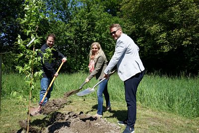 Die zwischen Krankenhausberg und Friedhofstraße gelegene Streuobstwiese ist um einen weiteren Kinderbaum größer geworden. Bürgermeister Michael Hetzl pflanzte dieses Jahr eine Kornelkirsche – gemeinsam mit Stadtbaumeisterin Birgit Weichselgartner, dem städtischen Landschaftsarchitekten Johannes Hennersperger und Mitarbeitern des Bauhofs. Der Baum erinnert an den Geburtsjahrgang 2025.