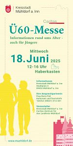 Die Kreisstadt Mühldorf a. Inn und das Caritas-Zentrum für den Landkreis Mühldorf laden ein zur Ü60-Messe am Mittwoch, 18. Juni. Von 12 bis 16 Uhr gibt es im Haberkasten, Fragnergasse 3, bei freiem Eintritt Informationen rund ums Alter. Für Seniorinnen und Senioren, aber auch für Jüngere gibt es ein umfangreiches Programm mit Vorträgen, Informationsständen und fachlicher Beratung. Mit Kaffee und Kuchen ab 14:30 Uhr ist für das leibliche Wohl gesorgt.