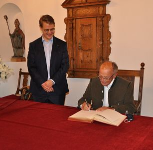 Im Rahmen der Auftaktveranstaltung „Neuer Heimatfilm unterwegs“ trug sich Bezirkstagspräsident Josef Mederer bei einem kleinen Empfang im Rathaus Mühldorf in das Goldene Buch der Kreisstadt ein. Der Bezirkstagspräsident freute sich, im großen Sitzungssaal des Rathauses gemeinsam mit erstem Bürgermeister Michael Hetzl den offiziellen Auftakt zum Filmwochenende „Neuer Heimatfilm unterwegs“ zu begehen. Gemeinsam mit den Schauspieler-Ehepaar Johanna Bittenbinder und Heinz-Josef Braun und Gewandmeisterin Alexandra Brandner, die sich ebenfalls ins Goldene Buch eintrugen, fuhr der Bezirkstagspräsident mit Oldtimern vor und lernte bei einem kurzen Empfang Vertreter aus Politik und Wirtschaft kennen, bevor es ins Kino „Hollywood am Inn“ zum Premierenfilm „Landrauschen“ ging.