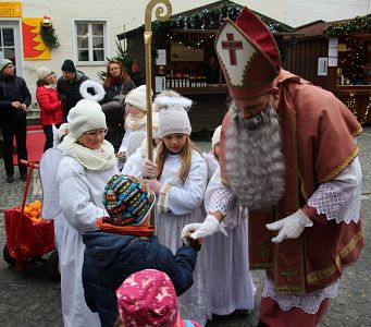 Erste Bürgermeisterin Marianne Zollner eröffnete – umrahmt von der ChorSingSchule St. Nikolaus und mit der Unterstützung des heiligen Nikolauses und seiner Engelsschar am Donnerstagnachmittag den Mühldorfer Christkindlmarkt. Der Nikolaus kam mit einer Eselskutsche und verteilte Süßigkeiten an die kleinen Besucher.