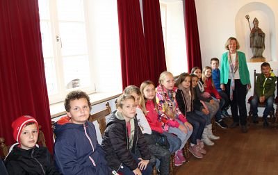 Nach einem kurzen Blick in das Büro und einem Einblick in die Arbeitswelt der Bürgermeisterin besichtigte die Klasse gemeinsam mit ihrer Lehrerin Daniela Panzer den großen Sitzungssaal. Hier erklärte die Erste Bürgermeisterin viel Wissenswertes zur Mühldorfer Stadtgeschichte. Anschließend nahmen die Kinder dann noch die Hexenkammer unter die Lupe, die von den Schülern auch betreten werden durfte.