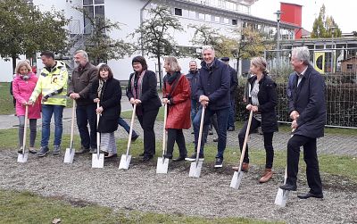 Die Grundschule Mößling wird größer: Zum Spatenstich traf sich Erste Bürgermeisterin Marianne Zollner mit den Vertretern der beteiligten Planungsbüros und den ausführenden Firmen. Auch die gesamte Schulfamilie feierte mit Rektorin Beate Waldinger-Kaindl diesen wichtigen Tag.