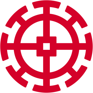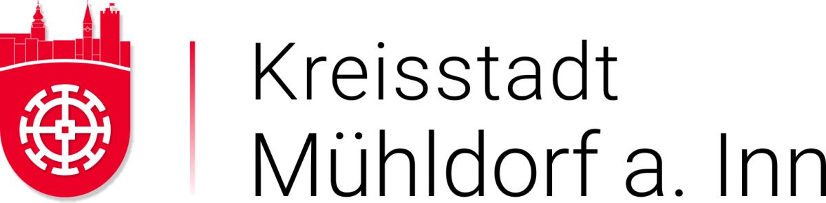 Das Logo der Kreisstadt Mühldorf a. Inn zeigt das weiße Mühlrad auf rotem Wappengrund, stilisiert den Inn sowie die Silhouette der wichtigsten Wahrzeichen der Altstadt mit Verweis auf den Inn-Salzach-Baustil.