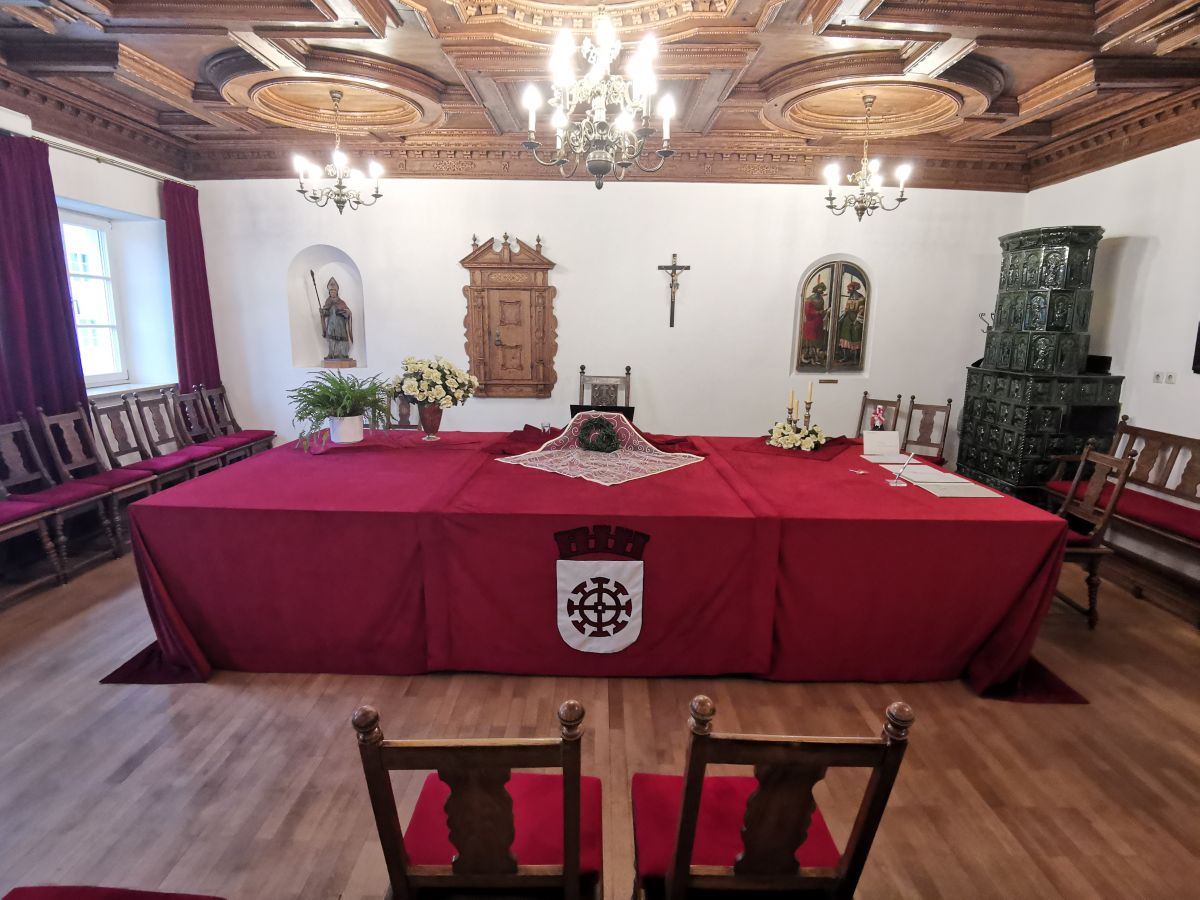 Am Rathaus angekommen wird Sie Ihr Weg über eine hölzerne Treppe hinauf in den großräumigen "Fletz" und dann in den prächtigen, von der italienischen Renaissance beeinflussten Sitzungssaal mit einer prunkvollen Doppeltüre aus dem Jahr 1641 führen, der heute als Trauungssaal dient und sich großer Beliebtheit erfreut.